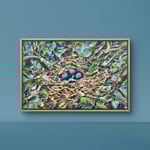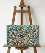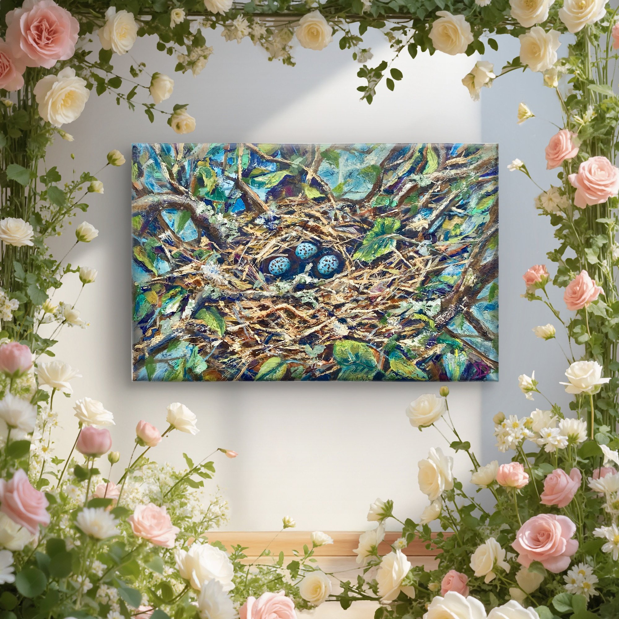 A soft worthy nest of 3 House Finch eggs, well hidden amongst lichen covered branches. Painted from my imagination.