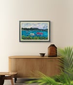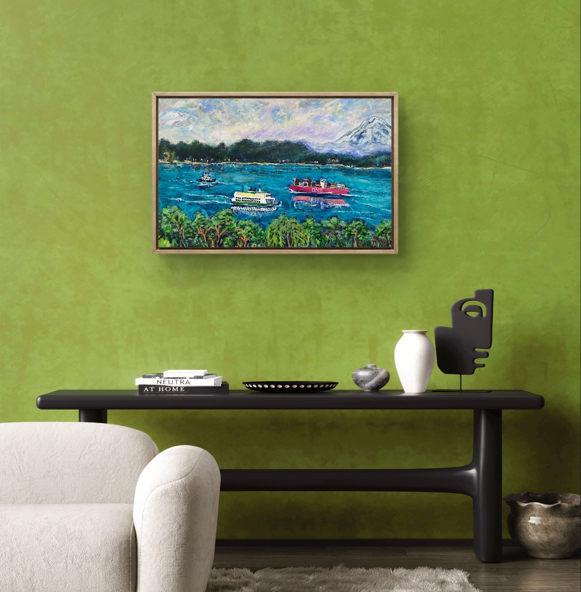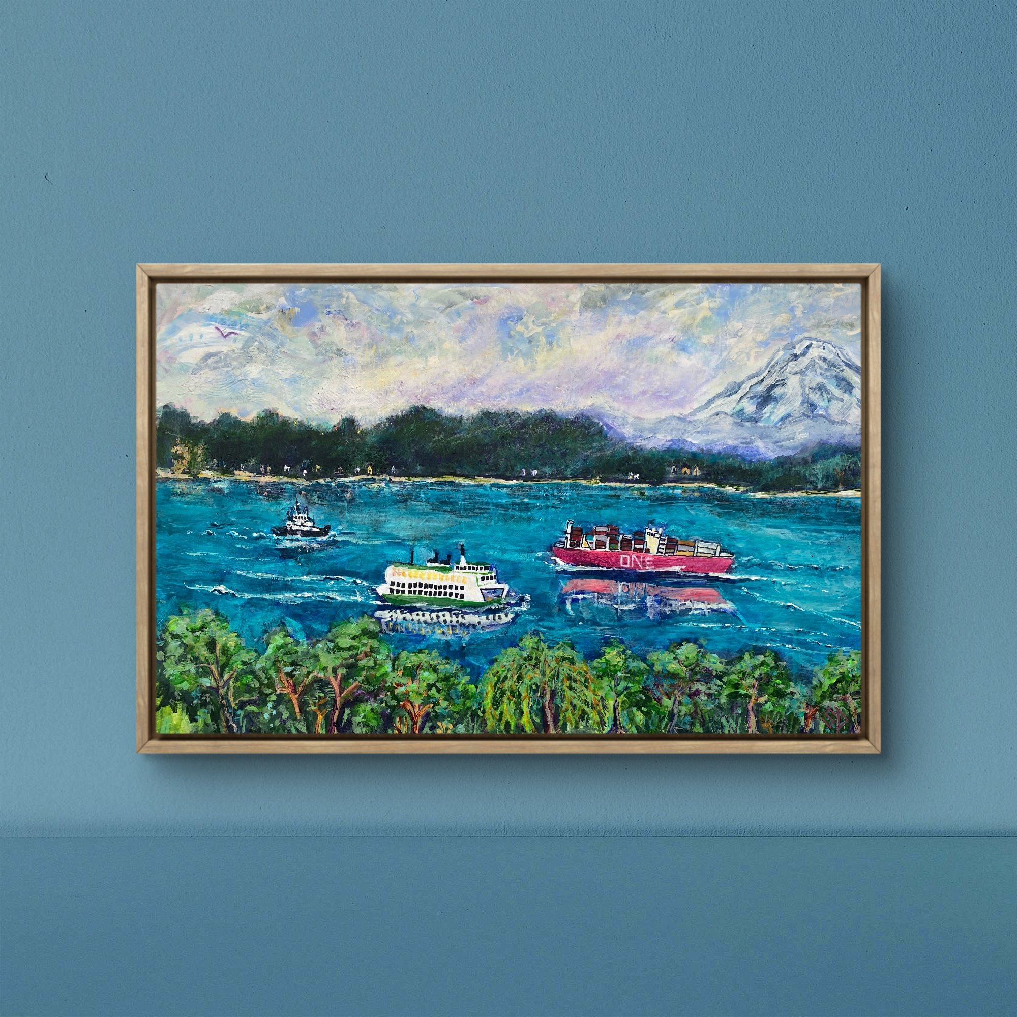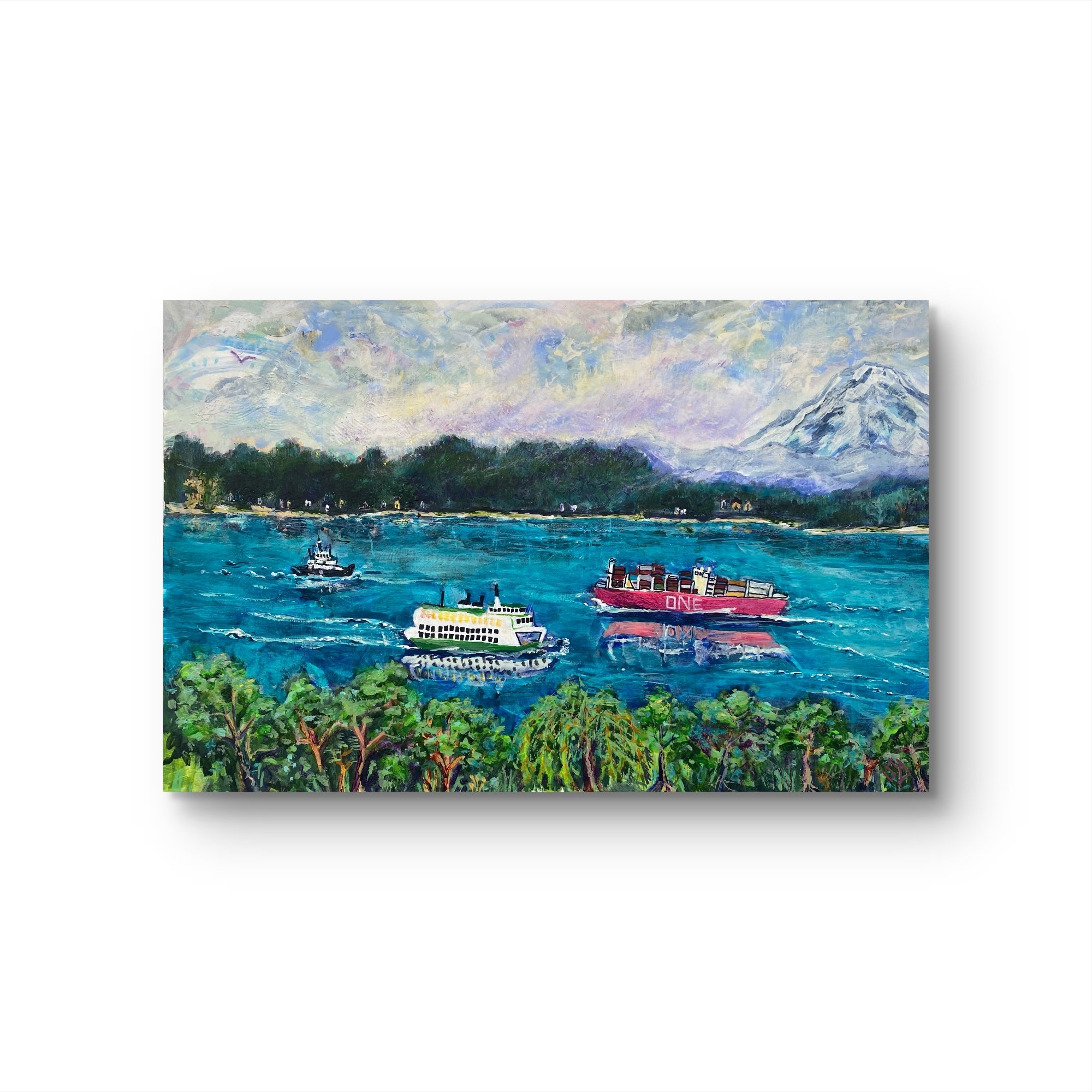 A view from our home of Tahoma, the Salish Sea and various boats that use it as their shipping lanes. Painted in Plein Air in multiple sessions.