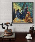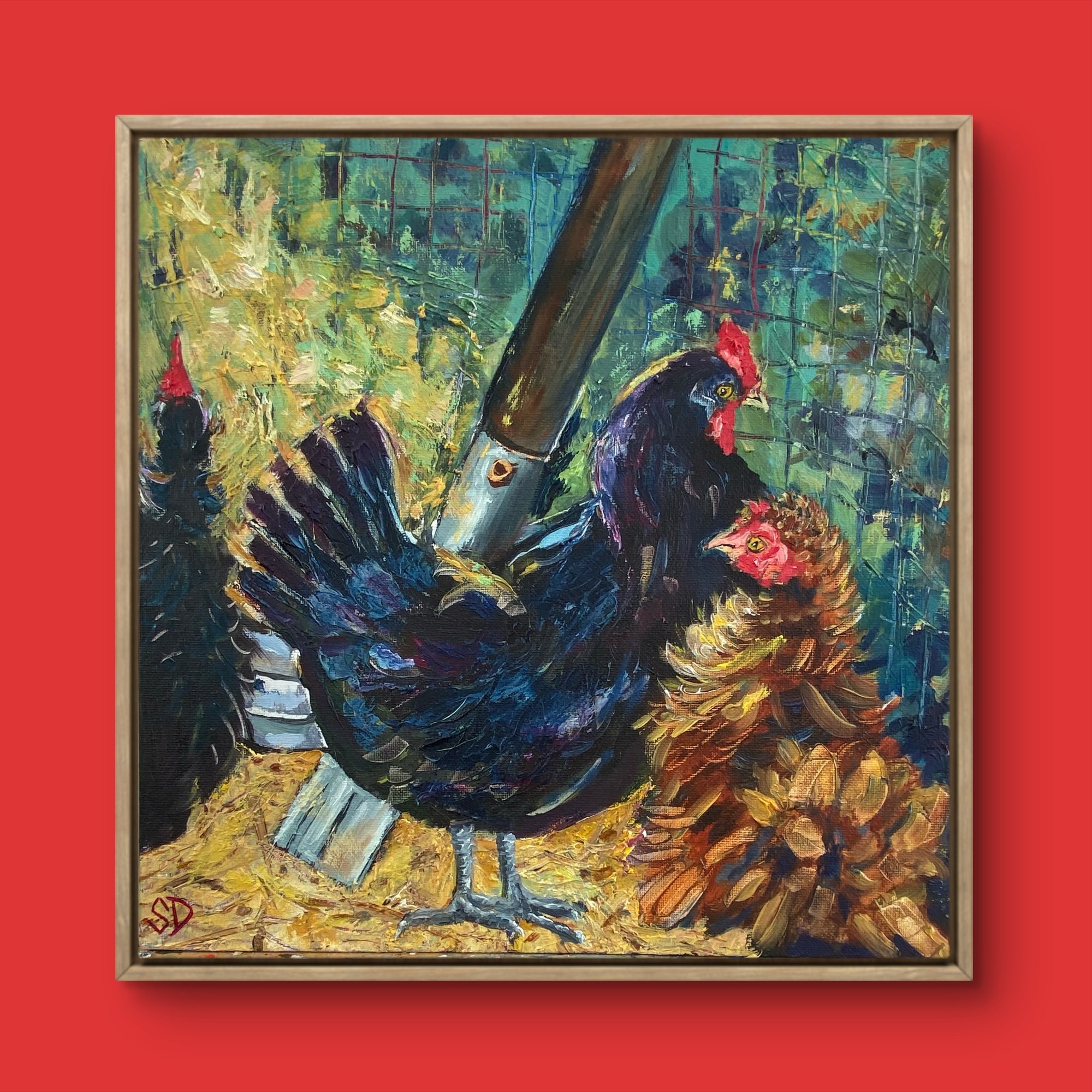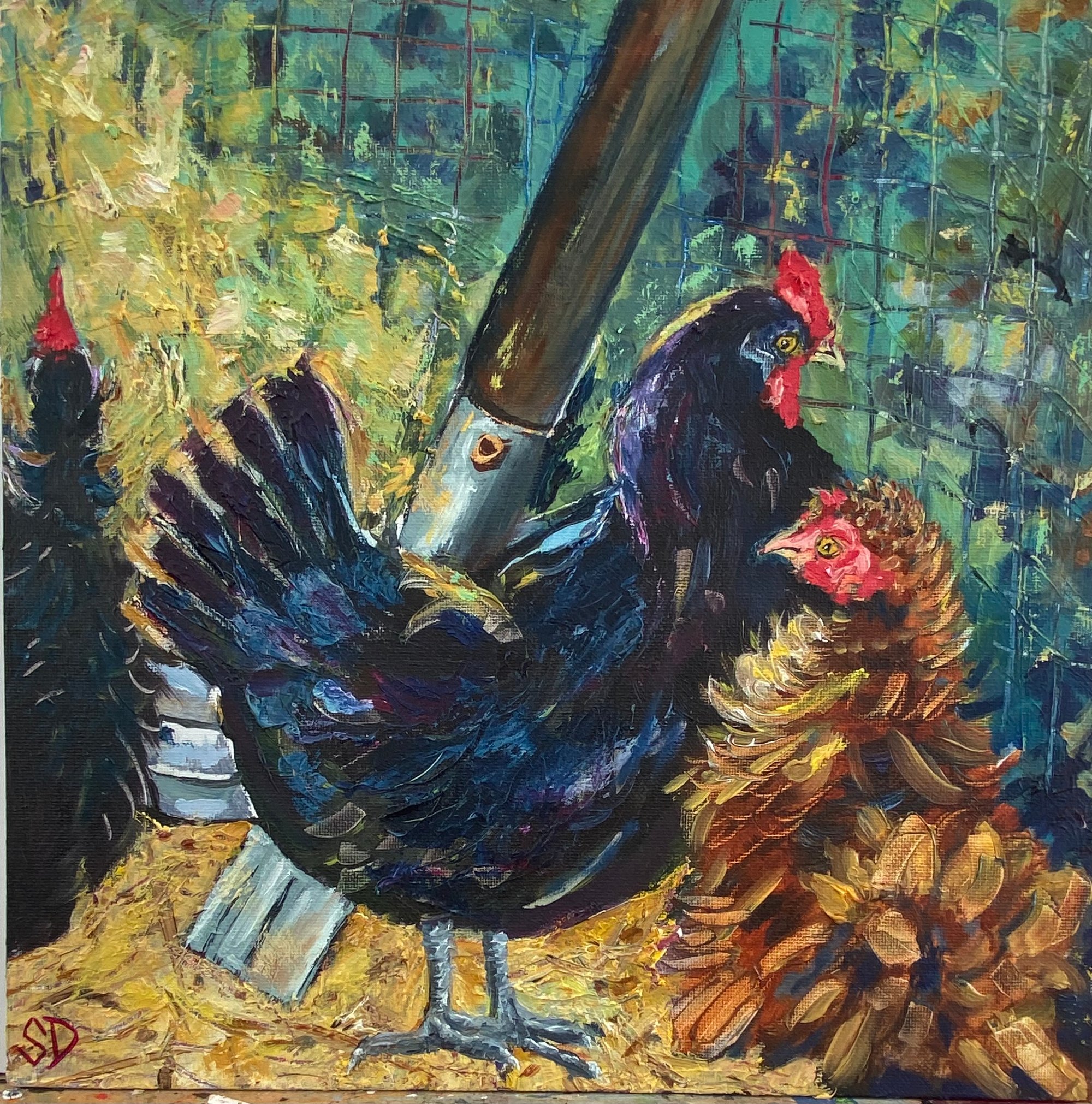Nina, our Black Copper Moran and Little Red, our Cochin Frizzle Banty broody mama