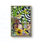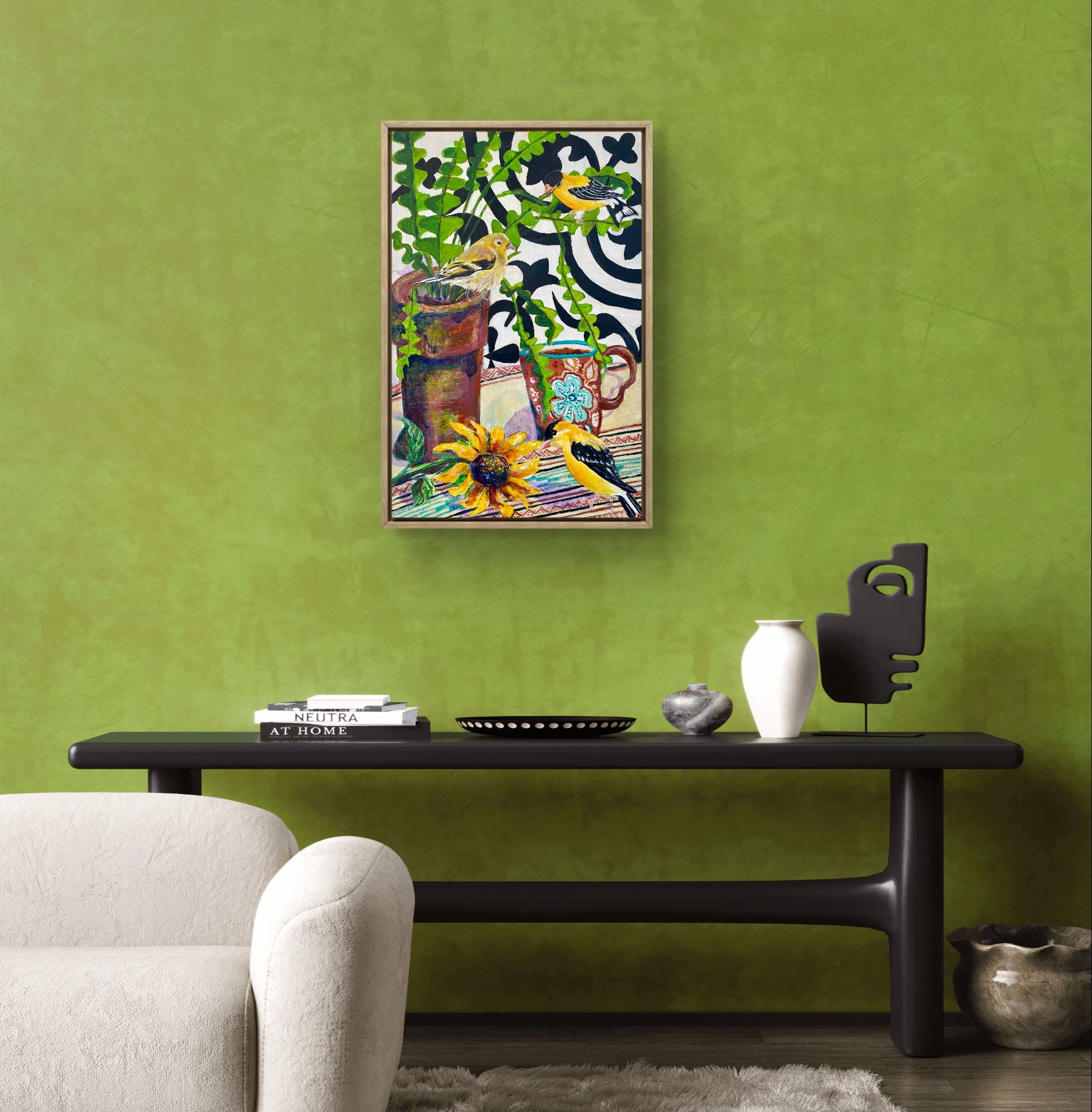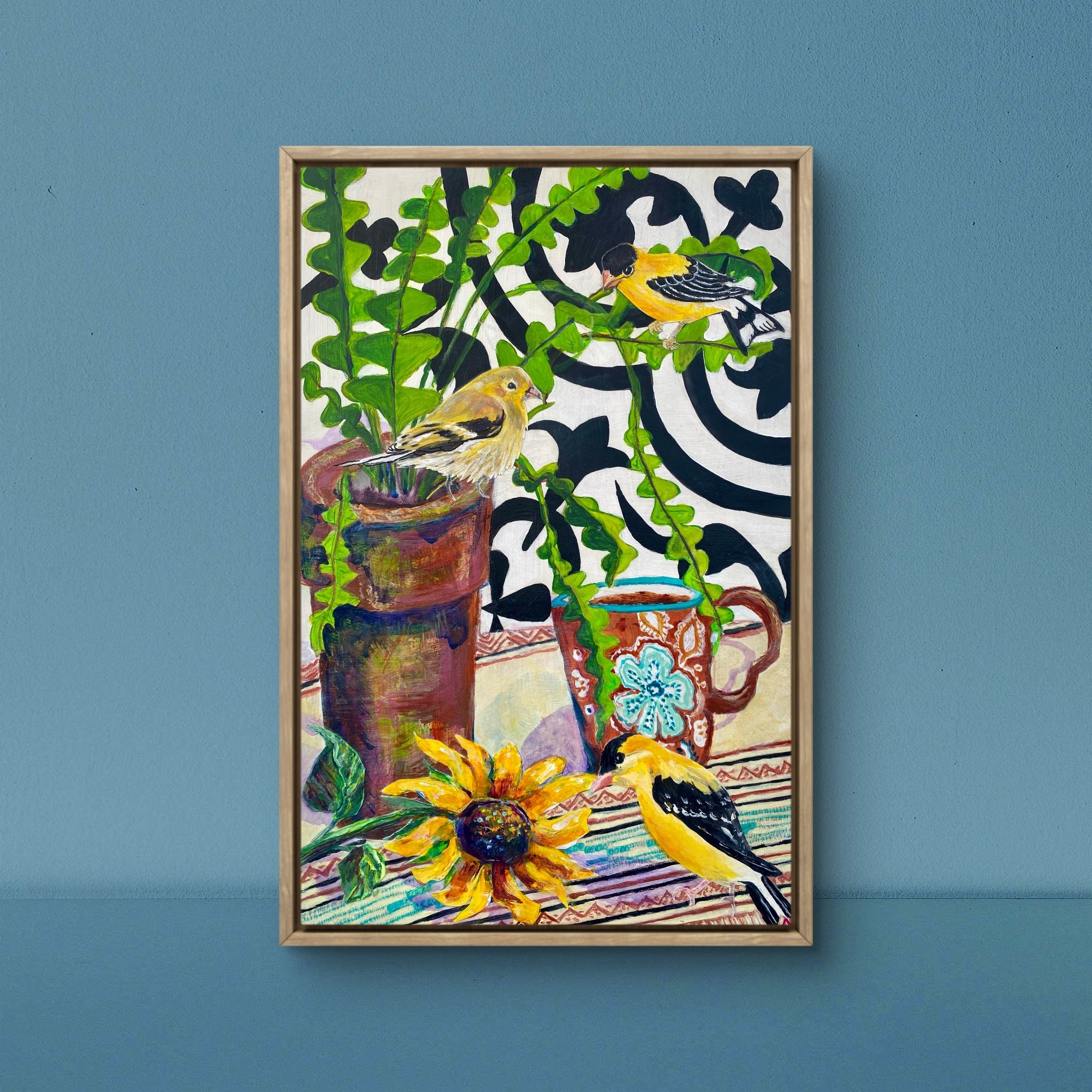 My favorite plant and teacup with 3 of our state birds eyeing the sunflower for a snack, a still life of my imagination.